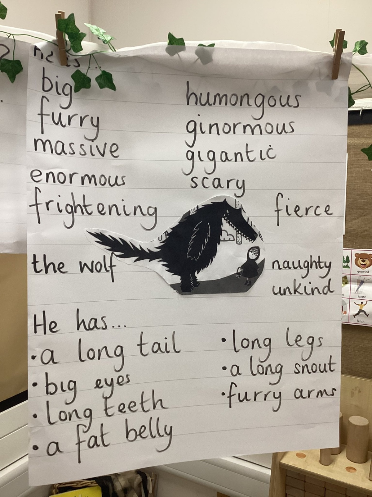 In Literacy we explored the character of the wolf from our story - we talked about what he looked like with our talk partners and used our new sentence stems to write about him.