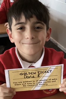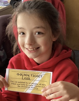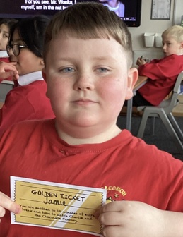 This morning Year 4 were surprised to find lots of golden tickets in our classroom. They had been hidden in very unusual places like plant pots, inside books and even on our classroom displays. Everyone in Year 4 had a ticket which entitled them to 10 minutes of extra play time and a chance to watch Charlie and the Chocolate Factory. We have just finished reading this book and were very excited to watch the film. Well done Year 4, after all your hard work in class and at the Decade Concert, you thoroughly deserve this treat.